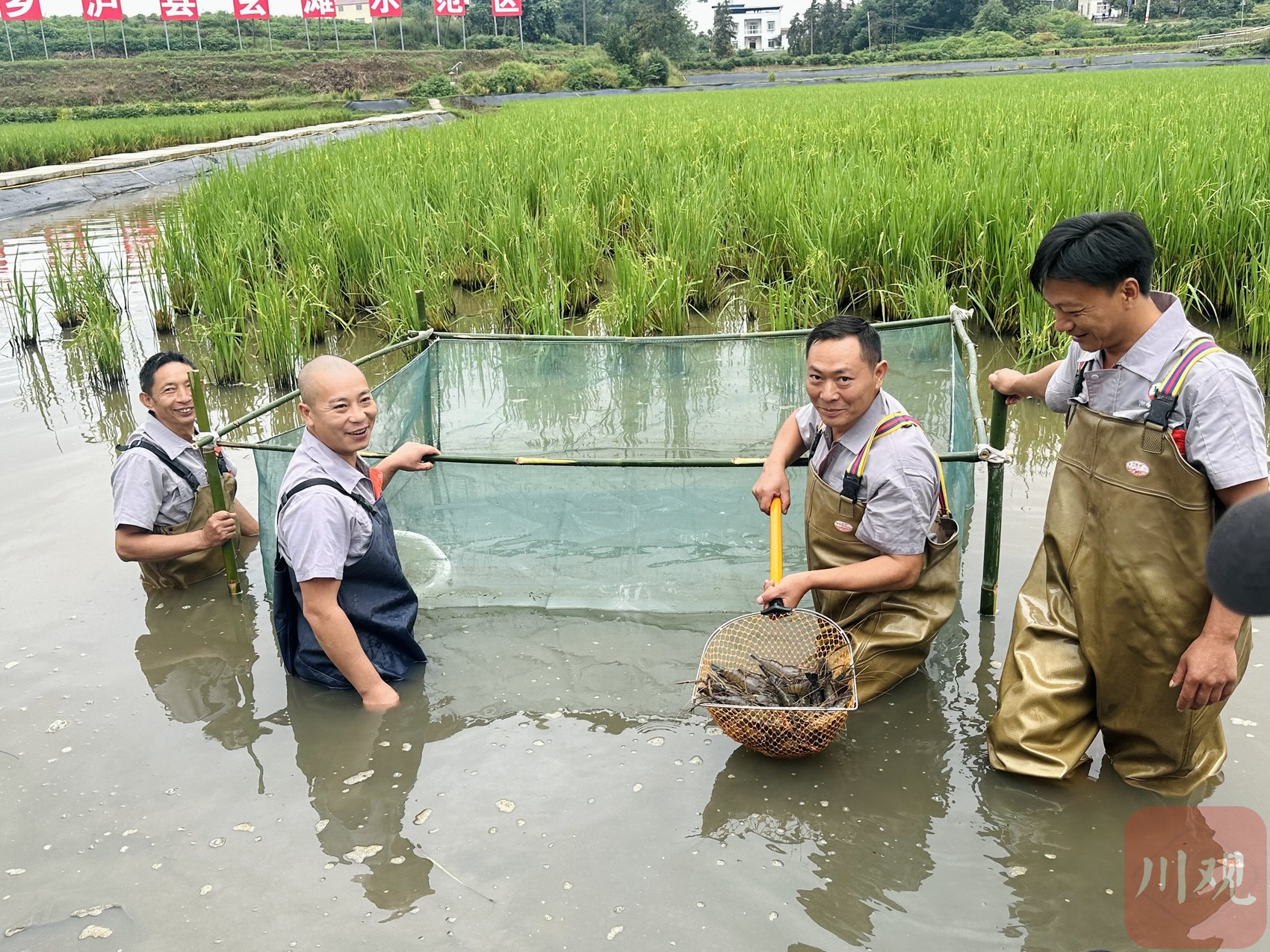 泸县玄滩镇新山村,双稻双虾养殖基地内,农户忙着打捞大头虾。